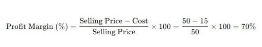 Suppose the overall price of a 50ml perfume of unisex is 15 dollars (with the oils, packaging, and work) and you are willing to sell the perfume at 50 dollars, then your profit margin will be: